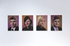 A temporary or permanently abnormal or alienated perception of the environment is called derealisation. Those affected feel people, their surroundings or objects to be incoherent and threatening. This work, created at the beginning of the artist’s studies, represents an attempt to visualise his condition as he experienced it. Four photographs show fictitious people, collages of the eyes, nose, mouth, ears, hairstyles and chins of several faces. The posture and clothes rank the portraits in the tradition of job application photos contrasting with a visible falseness which is additionally reinforced by the psychedelic-like background.